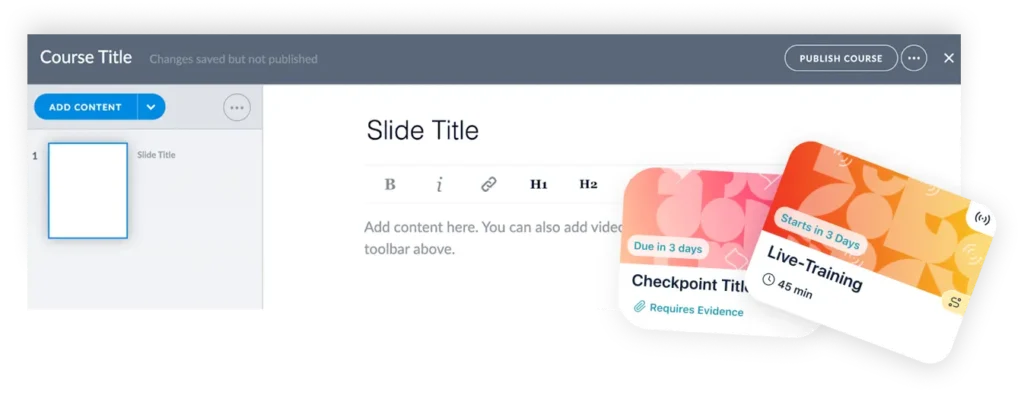 Our easy-to-use authoring tool makes it simple for anyone to create engaging training from scratch. Add images, videos or attachments and launch courses in minutes. Ideal for small teams who need something fast and easy.